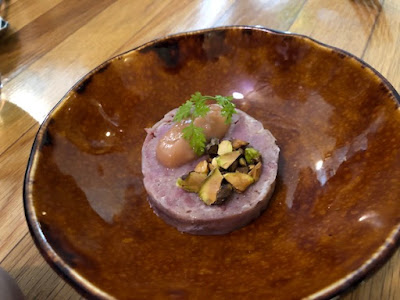 Ham Hock Terrine, Rhubarb, Pistachio Biscotti.